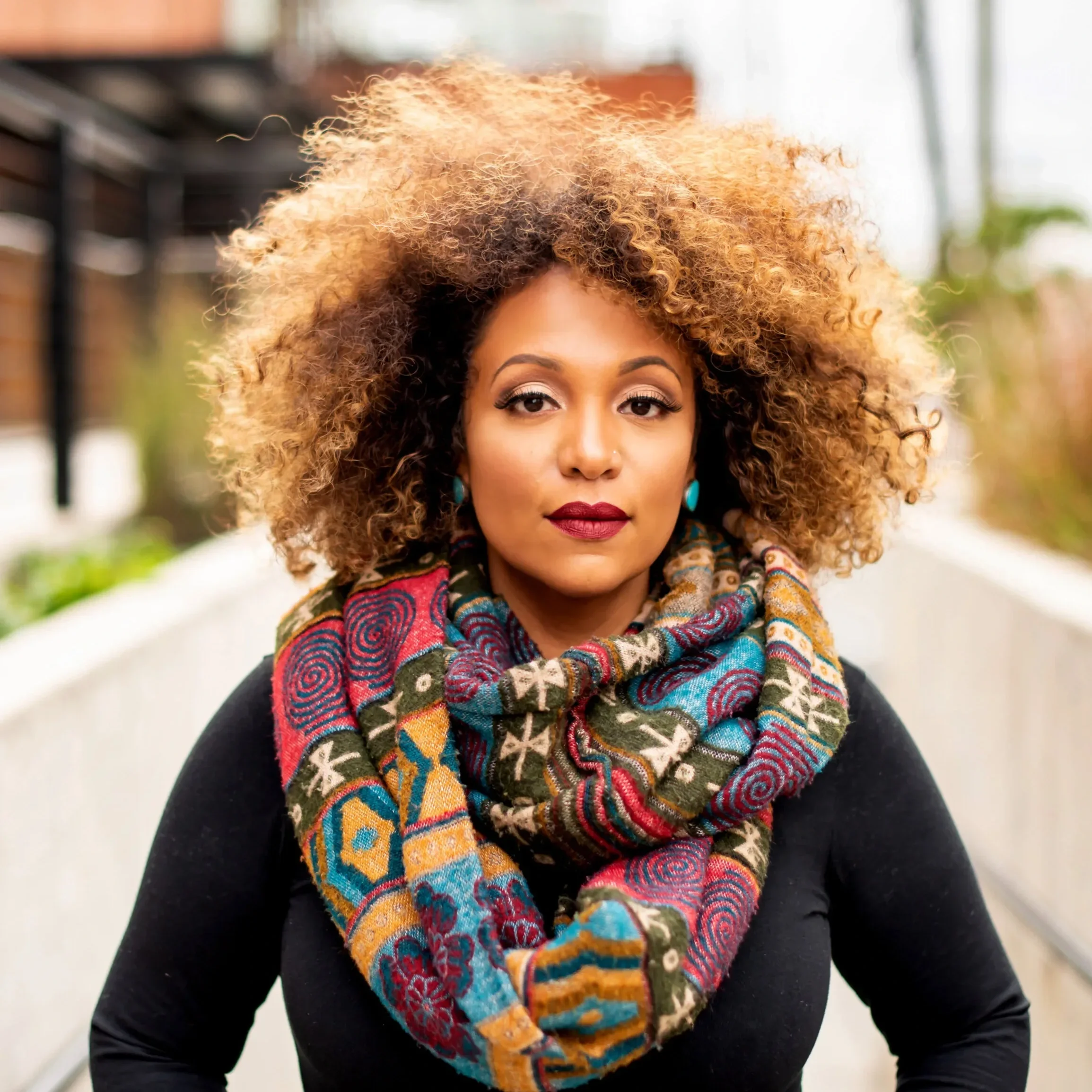 Iris Jacobs - A Black woman with curly, two-tone hair in shades of blonde and dark brown, wearing a colorful patterned scarf and earrings, outdoors with a blurred background.